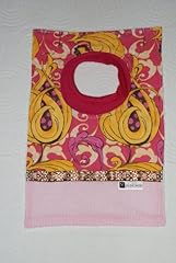 M is for milk bib.  Giant modern floral print in pink and yellow and a touch of brown, paired with pink gingham and a sophisticated brown scroll ribbon