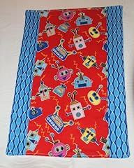 M is for milk burp cloth.  Friendly robots adorn this bright primary colored bib, set on a red background with a royal brue print to coordinate.