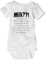 Babies grow up so fast don't they? One day they're sipping milk, the next day they want gourmet coffee! For the discerning baby in your life, get our Milk??! Baby Bodysuit. This silly bodysuit is perfect for fussy babies who just won't take milk for an answer, with a print depicting an order of a very sophisticated coffee (no foam, sugar-free, etc.). Each bodysuit is silk-screened by hand in the U.S. and is made of soft, 100% natural cotton. Various sizes available. Each sold separately.